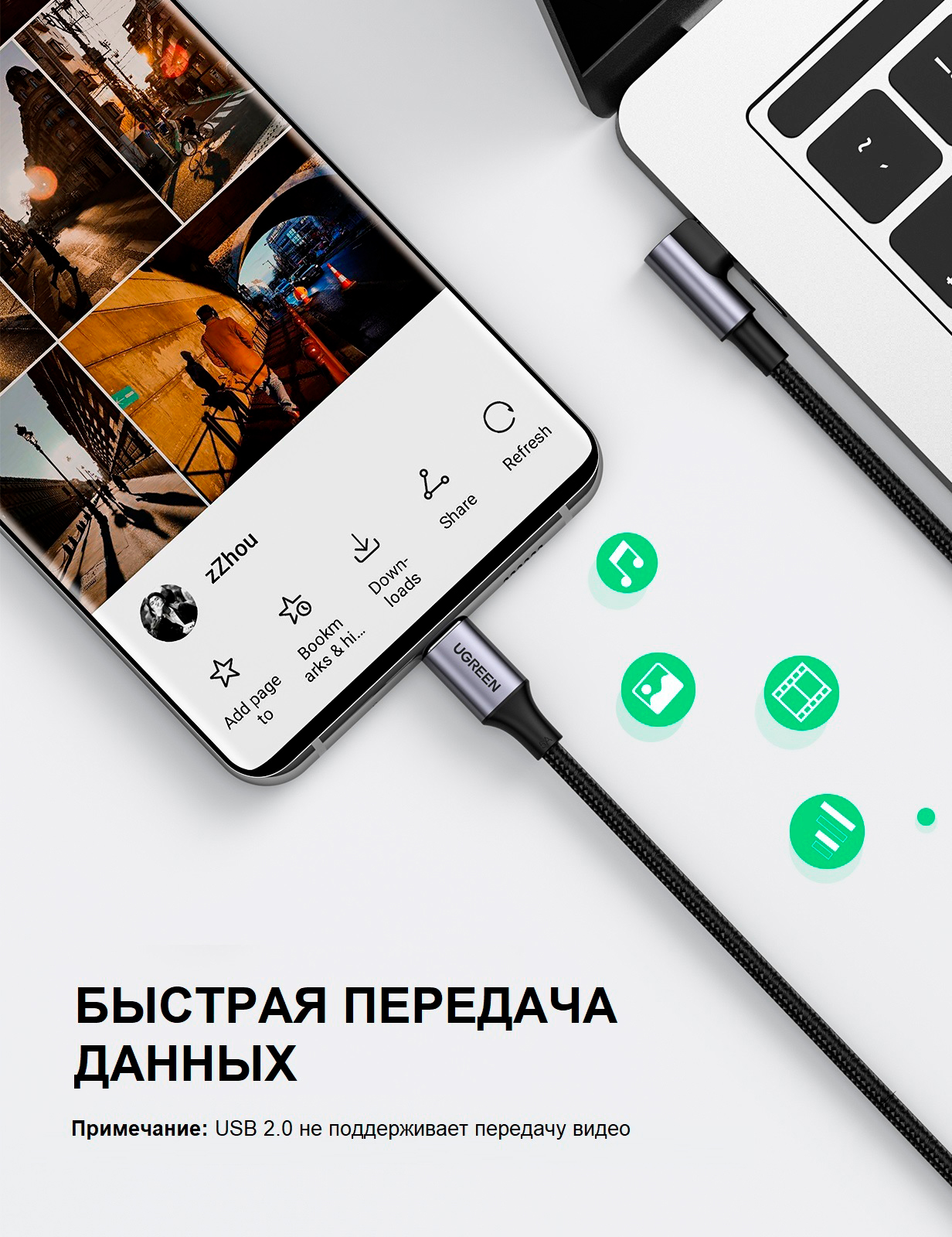 Данный кабель UGREEN c обеспечивает скорость передачи до 480 Мбит/с (USB 2.0), чтобы вы могли перемещать 1 ГБ фильмов, музыки, документов или всей библиотеки фотографий за 30 секунд.