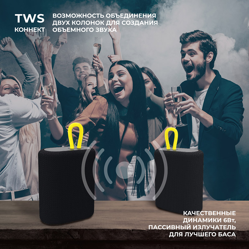 Качественные динамики, высокая мощность и пассивный излучатель обязательно произведут впечатление на всех присутствующих, а для создания объемного стереозвучания вы можете воспользоваться функцией объединения двух колонок.