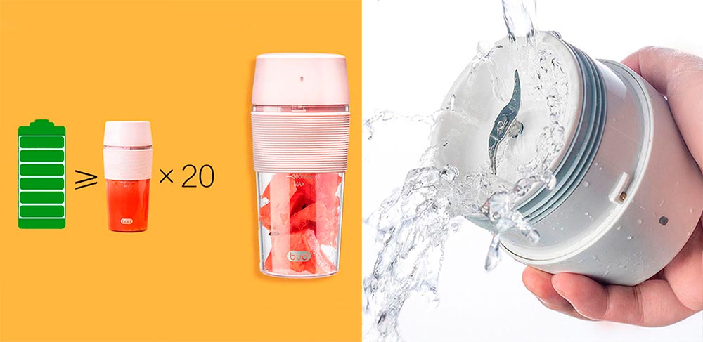 Компактный блендер для приготовления свежих соков и смузи в дороге, на работе и дома. Соковыжималка предназначена для индивидуального пользования, объем резервуара 300 мл – идеальная порция заряда витаминов на целый день.