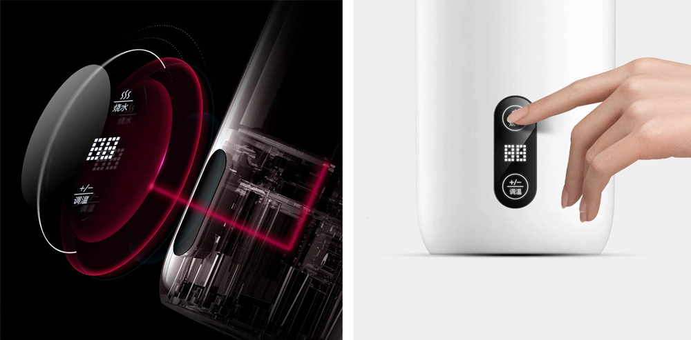 Регулировка температуры осуществляется с помощью сенсорного дисплея. На экране также отображаются данные о текущей температуре жидкости, что предотвращает вероятность получения ожогов. Термокружка поддерживает температуру в пределах 40-90°С. Есть функция автоматического поддержания температурных показателей, которая самостоятельно отключается спустя 2 часа. Время доведения до кипения 350 мл жидкости – 8 минут 30 секунд.