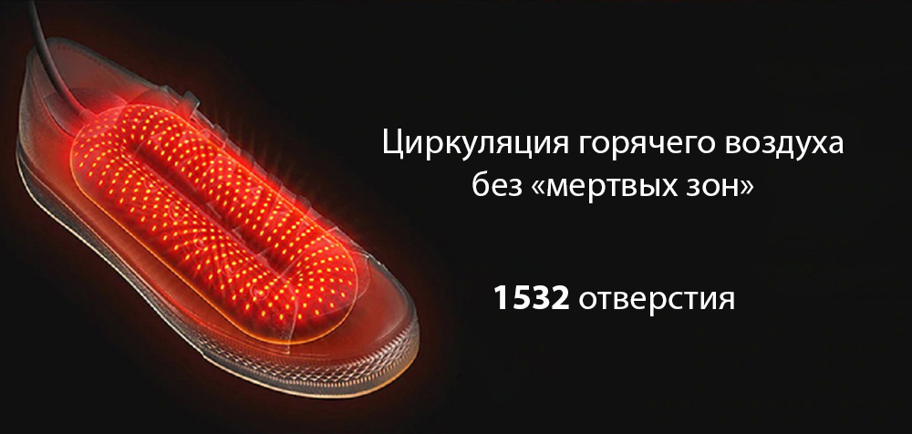 На поверхности сушилки имеется 1532 отверстия для равномерного отвода тепла от нагревателей и передаче его поверхности обуви. Во время работы сушилки внутри обуви создается закрытая среда с циркуляцией горячего воздуха, который добирается до всех уголков и удаляет влагу из сложных и узких мест.