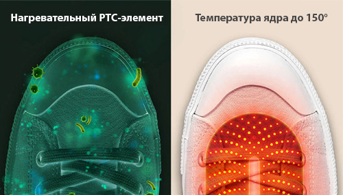 Благодаря высокой температуре нагрева с поверхности обуви удаляется большинство вредоносных бактерий. Сушилка обладает высокой степенью антибактериальности. Внутри сушилки находится специальный нагревательный элемент, который достигает температуры 150 градусов всего за несколько секунд.