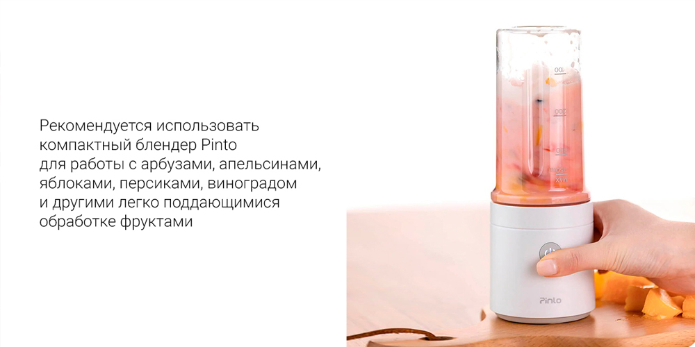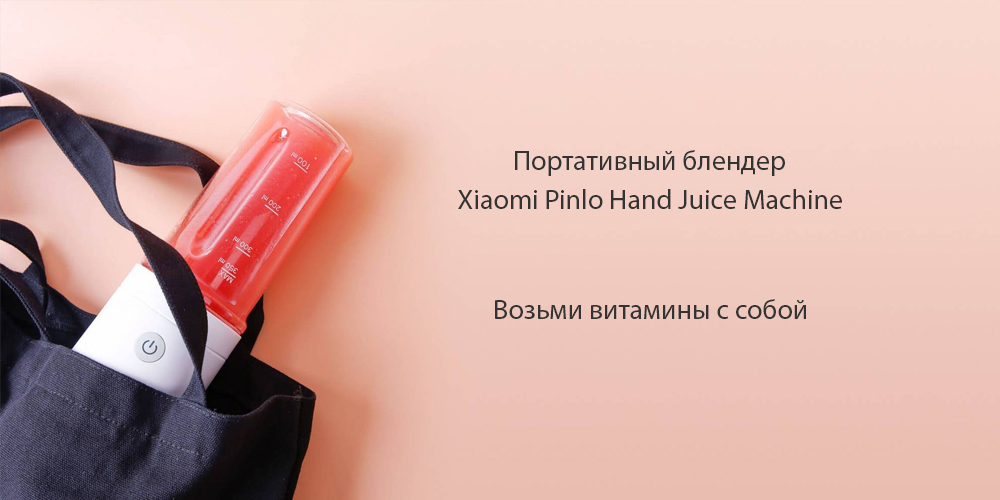 Компактный блендер Xiaomi Pinlo Hand Juice Machine PL-B007W3W объемом 350 мл, с встроенным аккумулятором емкостью 2000 мАч и зарядкой через microUSB. Номинальная мощность – 70 Вт. Ножи из нержавеющей стали.