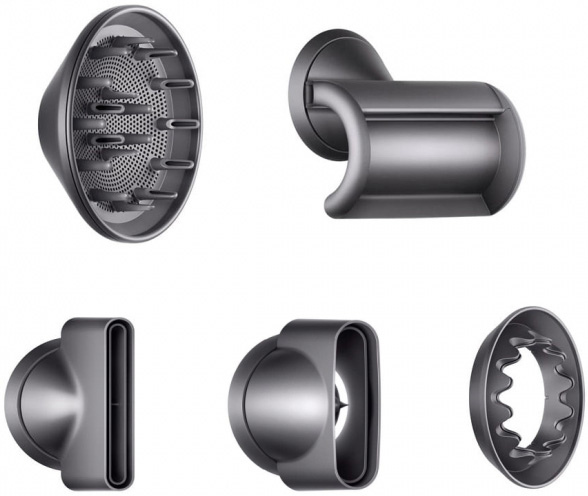 Дополнительные насадки на Dyson Supersonic HD08 держатся благодаря магнитам. Подобный механизм крепления удобно использовать для моментальной первоначальной установки, а также быстрой замены в процессе укладки. В комплект поставки включены пять насадок для фена с различным предназначением.