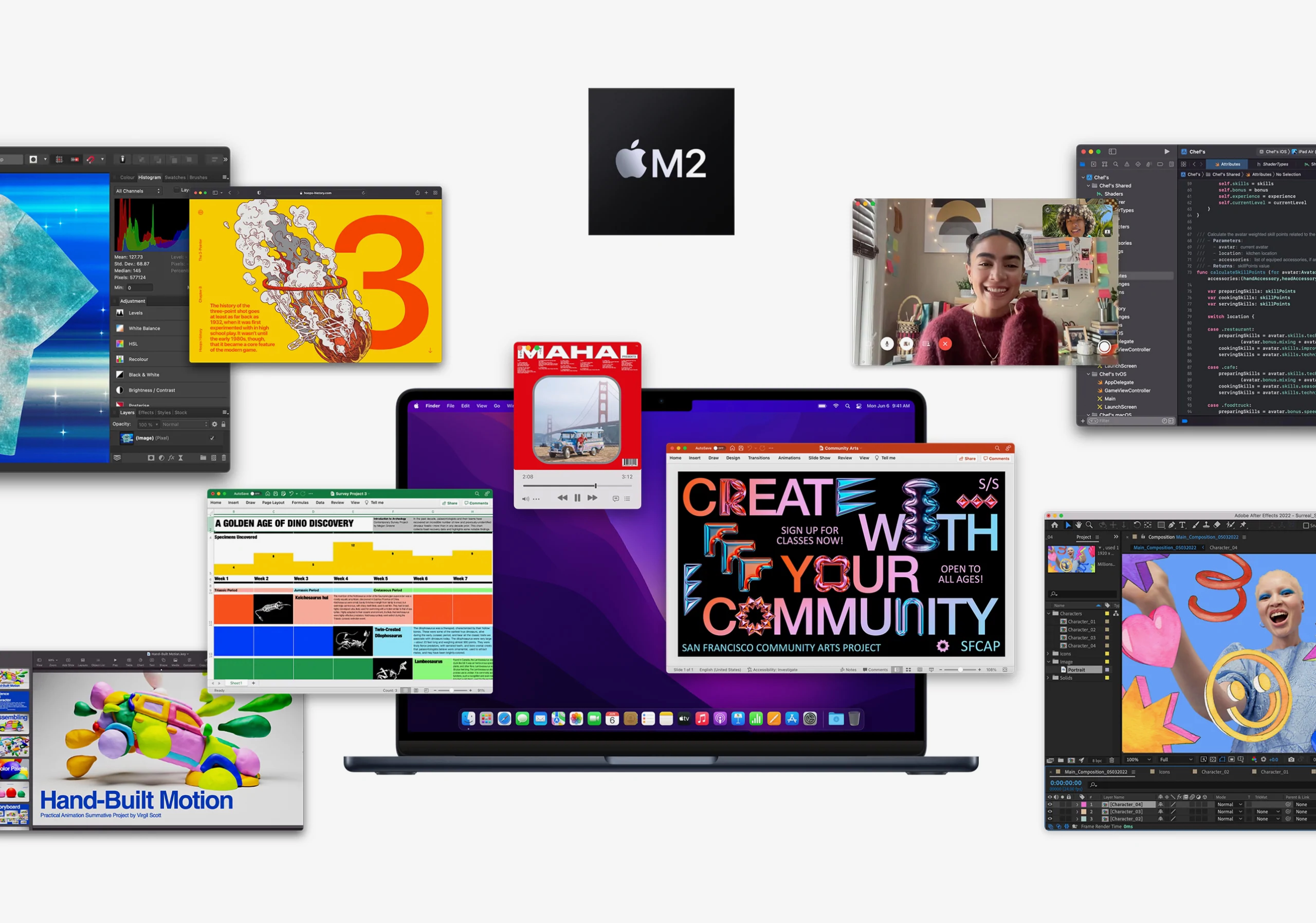 MacBook Air на базе чипа M2 нового поколения отличается невероятной скоростью работы и энергоэффективностью, а его удивительно тонкий корпус сделан полностью из алюминия. Это сверхпортативный и сверхмощный ноутбук, на котором можно работать, играть или создавать что угодно — где удобно.
